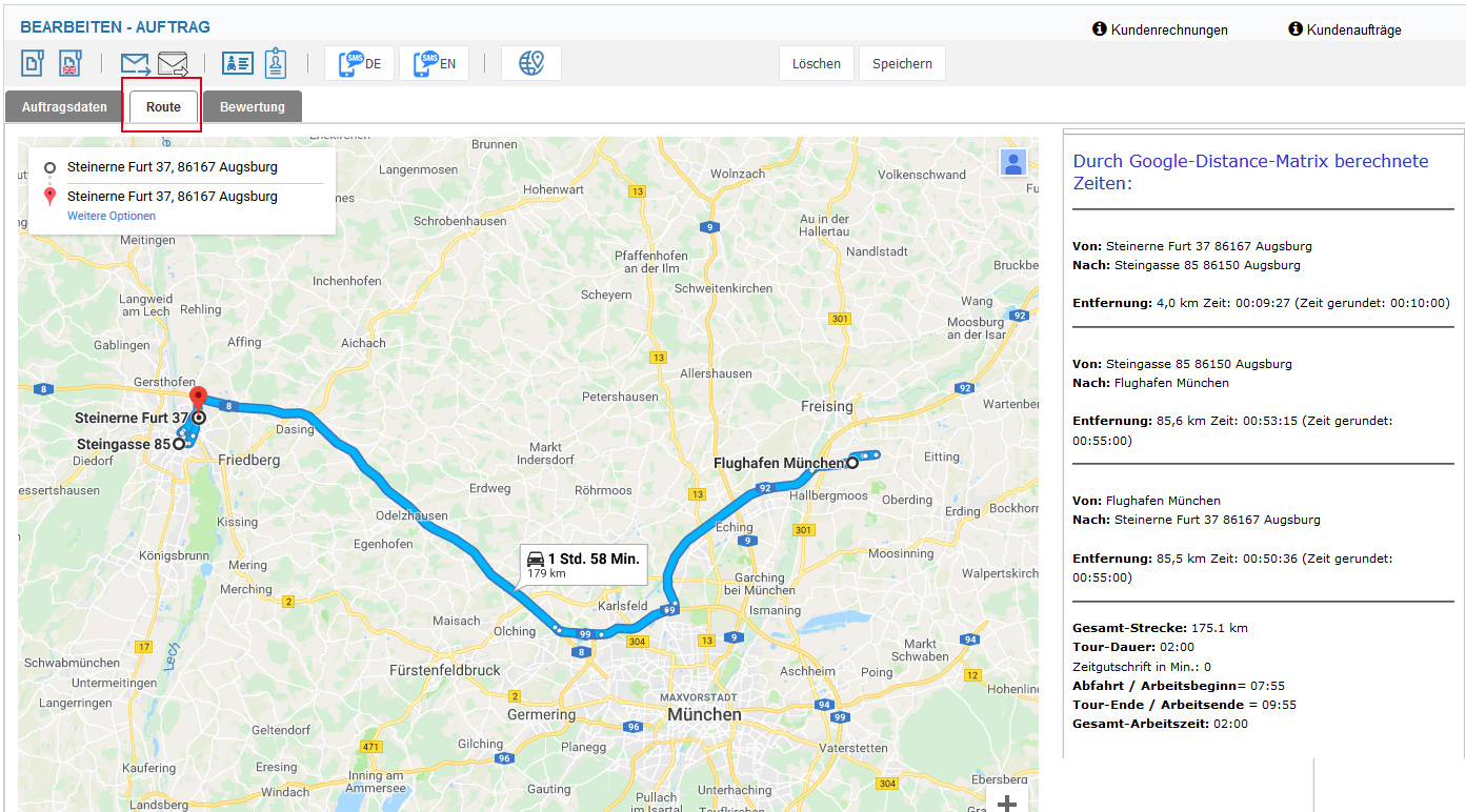 Sofern das Modul „Automatische Weg- und Fahrzeitberechnung“ dazugebucht wurde, die An- und Abfahrtszeiten automatisch berechnet und inklusive der Wegstrecken auf der Karte angezeigt.