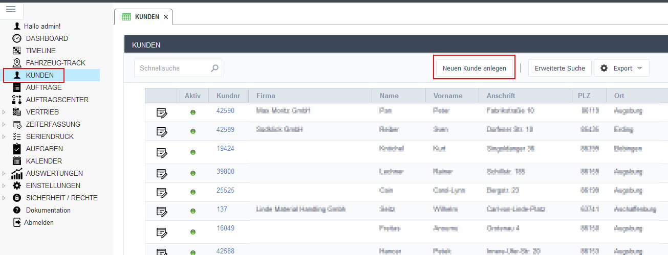 3. Mit dem erneuten Klick auf “Kunden” gelangen Sie zurück auf die Kunden Übersichtsseite.